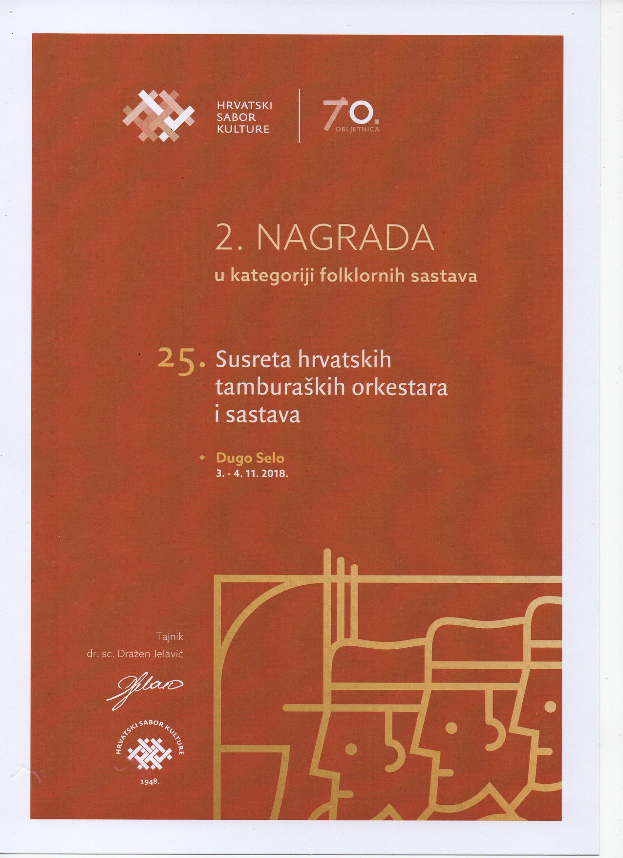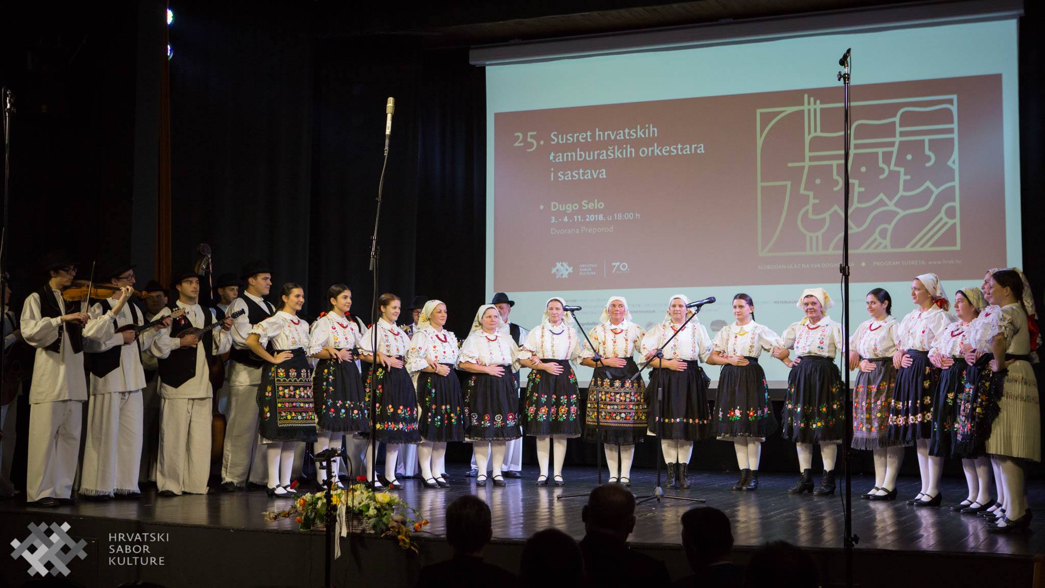 Dugo Selo, 3. studenoga 2018. godine – U organizaciji Hrvatskog sabora kulture i suorganizaciji Zajednice kulturno umjetničkih udruga Zagrebačke županije, KUD-a „Preporod“ i HDS ZAMP-a, u dvorani „Preporod“ u Dugom Selu 3. studenoga 2018. s početkom u 18 sati održan je prvi dio 25. Susreta hrvatskih tamburaških orkestara i sastava. Na njemu će se predstaviti i natjecati ukupno 350 najboljih hrvatskih tamburaša iz 18 orkestara i sastava, izabranih na županijskim smotrama od strane selektora.