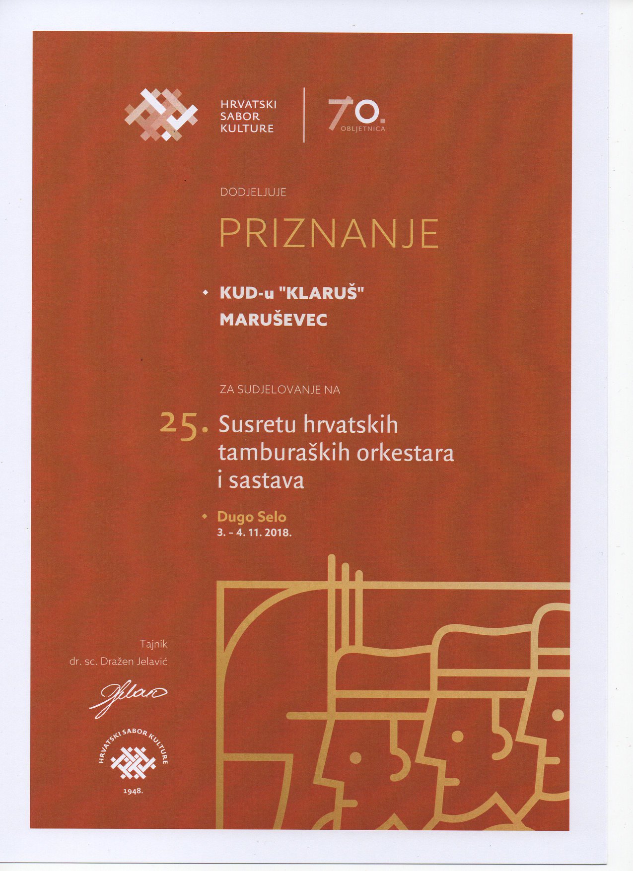 Dugo Selo, 3. studenoga 2018. godine – U organizaciji Hrvatskog sabora kulture i suorganizaciji Zajednice kulturno umjetničkih udruga Zagrebačke županije, KUD-a „Preporod“ i HDS ZAMP-a, u dvorani „Preporod“ u Dugom Selu 3. studenoga 2018. s početkom u 18 sati održan je prvi dio 25. Susreta hrvatskih tamburaških orkestara i sastava. Na njemu će se predstaviti i natjecati ukupno 350 najboljih hrvatskih tamburaša iz 18 orkestara i sastava, izabranih na županijskim smotrama od strane selektora.